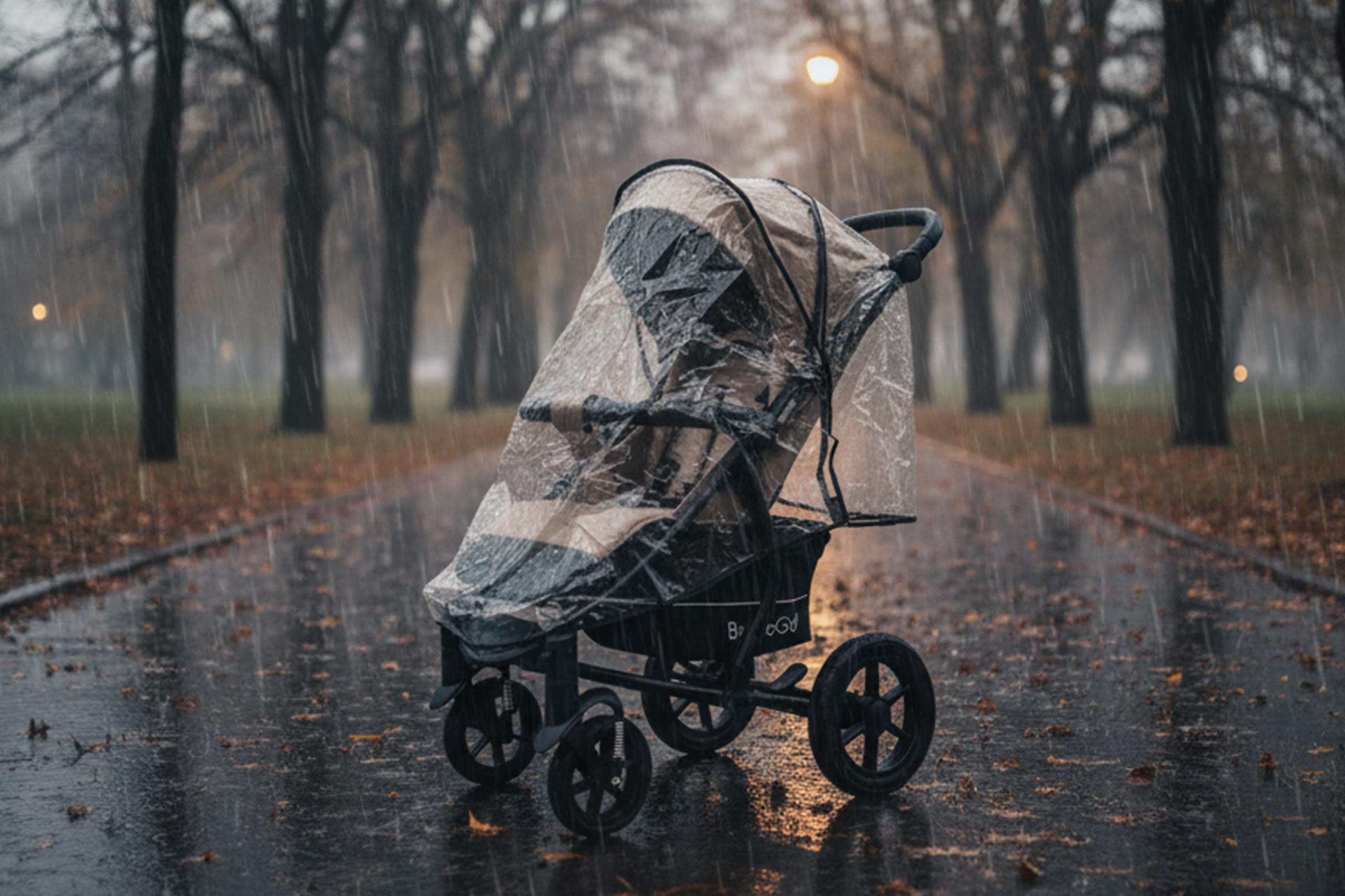 Дождевик, который полностью укрывает коляску от дождя и снега. Он точно не позволит погоде застать вас врасплох.