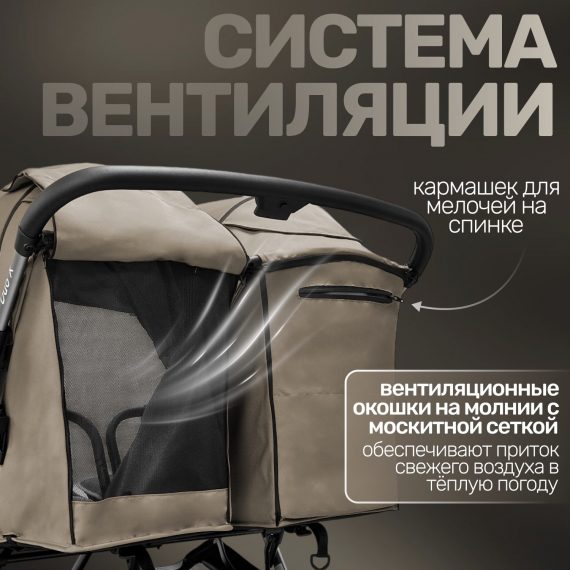 Экстраглубокий капор оснащён противоветровым клапаном со смотровым окошком на магнитах, а боковые молнии с секцией проветривания позволяют легко регулировать микроклимат внутри люльки.