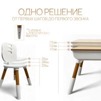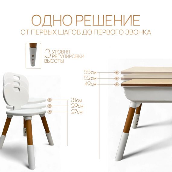 Регулируемая высота стола (49–55 см) и стула (27–31 см) позволяет подстраивать мебель под рост ребёнка — от первого года жизни до школьного возраста.